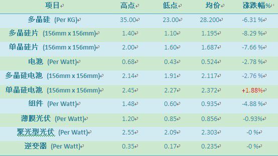 索比光伏网讯:今日光伏" title="光伏新闻专题">光伏现货报价,多晶硅片与光伏电池依然同步呈现走跌的趋势。在多晶硅方面,目前成交价最低到23美元/kg,而平均价位下滑到28.2美元/kg,跌幅为6.31%;而在硅片片部分,多晶硅片最低价格仍然维持在1.1美元/piece;而单晶的最低价格则为1.6美元/piece;本周多晶硅片价格仍然出现明显下降,平均价格到1.195美元/piece,跌幅为8.29%,北极星太阳能光伏网认为在中小型厂商退出市场后,价格有望回稳;而单晶硅片则到1.687美元/piece,跌幅为7.66%。而在光伏电池方面,最低价格仍到0.43美元/瓦,平均价格则滑落到0.524美元/瓦,跌幅为2.78%;另外在光伏组件方面,虽然晶硅光伏组件的平均价格持续下滑到0.935美元/瓦,跌幅为4.88%;而薄膜光伏部分也是下滑的状况,平均价格到0.856美元,跌幅为0.93%。今天值得欣慰的是,156mm单晶硅光伏电池首度为光伏产品带来了信心,虽然只上涨了1.18个百分点,但这也是季度以来首度上涨。