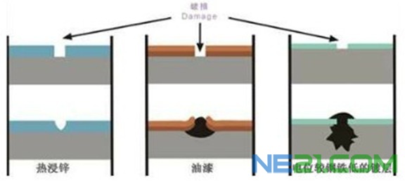 3.阴极防蚀保护:由于锌之电位比钢铁高,故锈蚀时锌会作出牺牲去保护钢铁。