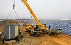 索比光伏网讯:11月22日,工人在吊装变压配电装置。由中电投投资3.26亿元建设的两万千瓦光伏" title="光伏新闻专题">光伏项目,是中电投在新疆建设的第一批大型光伏电站项目。电站全部采用能源转换率较高、技术成熟的多晶硅太阳能电池组件,项目于今年3月在哈密开工,目前工程建设进入尾声,据工程技术人员介绍该电站近日将投入运行。
