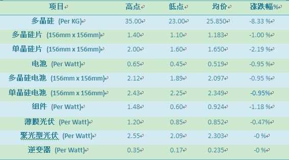 在最近的一周中,光伏现货报价部分,多晶硅、硅片、与光伏电池依然同步呈现走跌的趋势,但除多晶硅外,其余跌幅出现减缓的状态。在多晶硅方面,目前成交价最低仍维持在$23/kg,而平均价位下滑到25.85美元/公斤,跌幅为8.33%;而在硅片部分,最低的多晶价格仍然维持在1.1美元/片;而单晶的最低价格则为1.6美元/片;本周片状多晶硅价格平均来到1.183美元/片,跌幅为1.00%;而单晶硅片则来到1.65美元/片,跌幅为2.19%,此一跌幅收敛的状况符合Energytrend上星期对于市场未来发展的预估。