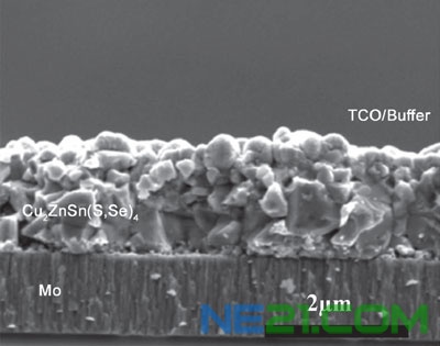 扫描电子显微镜图像:铜锌锡硫族光电器件的横截面。铜锌锡硫族薄膜显示出大晶粒和一些空洞。 来源:华盛顿大学