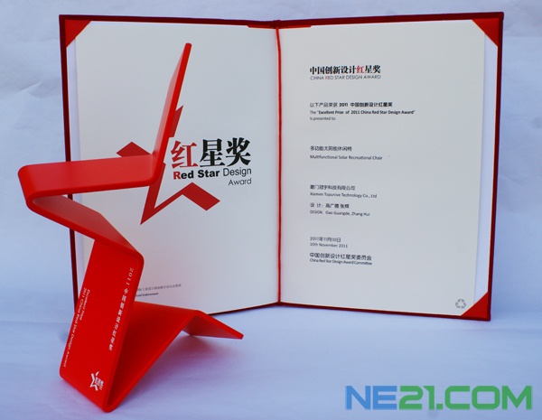 冠宇科技设计的“多功能太阳能座椅”凭借现代感的优美造型、强大的应用功能和PV-LED“零碳照明”的环保理念从众多产品中脱颖而出,当仁不让的获得“2011中国创新设计红星奖”。