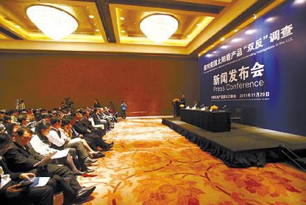 索比光伏网讯:苗连生、施正荣等国内光伏" title="光伏新闻专题">光伏业产业的“大佬”罕见地坐在同一张桌子上。他们此刻正共同面对来自美国的“双反”调查。昨日(29日)下午,由中国机电产品进出口商会牵头的“应对美国太阳能产品‘双反’调查新闻发布会”上,这些行业“大佬”均表示,“双反”调查申请是对中国光伏产业及光伏产品对美出口现状的歪曲,任何最终实施的贸易限制措施,必将对中美两国绿色能源产业的可持续发展造成严重损害。