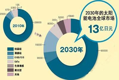 以由铜、铟、镓、硒构成的化合物为原料,被称为CIGS或CIS的太阳能电池预计将出现迅速增长。2010年为670亿日元,到2030年将扩大到1.6万亿日元,约为2010年的24倍。