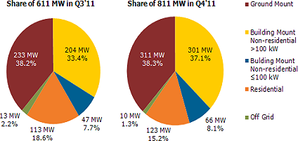 第三季,美国光伏市场比第二季增长32%,当时全年的装机量是1.9GW,也就是说连续第二年翻了一倍。而第三季和第四季的大型非住宅和市政工程项目,已经到美国联邦现款拨款兑现的期限,从而推动加大施工力度以满足拨款要求规定的标准,这期间的安装将会覆盖2012年全年。