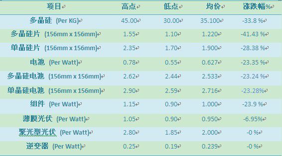 来源:发布时间:2011-12-01 10:52:45 索比光伏网讯:今日光伏" title="光伏新闻专题">光伏产品合约报价,多晶硅价格下挫至35美元,跌幅达33.8%,156多晶硅片与多晶硅片均下挫幅度较大,跌幅分别为41.43%与28.38%;156太阳能多晶硅与单晶硅光伏电池跌幅均达23%以上,多晶硅光伏电池最低价至2.44美元/片,单晶硅光伏电池最低价至2.59美元/片;光伏组件也没有逃出大幅下搓的命运,达23.9%,最低价至0.9美元/瓦。