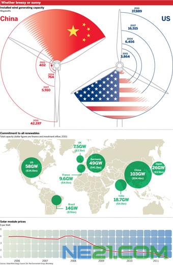 中国的“绿色行动”大致始于10年前,当时能源消耗激增和污染造成的恶性影响开始令中国领导人感到担忧。2007年,中国政府发布了一项发展风力、太阳能和生物燃油的规划。自那时起直到今年,中国风力发电产能逐年翻番。根据密切关注可再生能源行业的美国皮尤慈善信托基金会(Pew Charitable Trusts)的统计,2010年中国已成为全球最大的清洁能源投资国,全年公共急私人投资总计544亿美元。