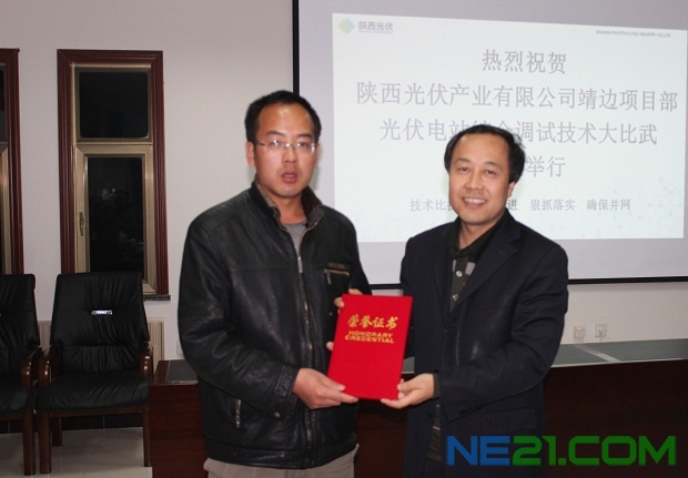 12月2日晚,陕西光伏产业有限公司(下简称:SNPV)靖边项目部在SNPV综合楼会议室隆重举行了光伏电站综合调试技术比武活动。参与靖边20MWp电站调试的技术人员参加了比赛,SNPV公司总经理刘宏兵出席了活动并作了重要讲话,参与靖边电站建设的江苏一建、长岭光伏、化建电仪、地电监理及设备供货厂商等单位代表也参加了活动。