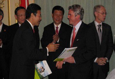习近平副主席和现欧盟总统范龙佩(当时为比利时首相)见证中广核集团董事长与羿飞集团董事长举行合资公司签约