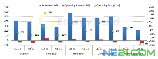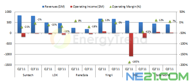 太阳能厂商第三季度财报陆续出炉后,相较于只投入矽外延片、电池或是模组的专业制造商,具有领导地位的垂直整合厂商,在毛利上仍可保有较佳的获利表现,不过由于市场价格与成本贴近,加上部份出货数量不如预期,大型厂商必须负担较沉重的营运成本,具有成本优势的中国厂商,也无一幸免的在营业利益率上缴出亏损的成绩单。