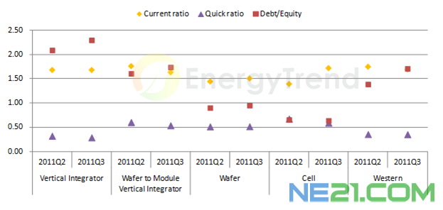 综观整体的财务情况,可以发现厂商手上所持有的现金流量降低、应收帐款增加、库存增加,连带的在财务风险面的指标,包含流动比率、速动比率都呈现令人担心的变化,因此在第三季度财报公布前,就有数家大厂传出短期周转不灵,付款延迟的情况。因此在市场供需不平衡的情况下,厂商都将采取一致的保守策略,减缓产能扩张、出清库存、降低产能等来保持手上的现金流量,避免短期可能出现的流动性风险。从第三季度的财报以及市场上的价格变化,集邦科技(TrendForce)旗下分析部门EnergyTrend认为部分厂商已经将库存控制在可接受范围,不过受到市场需求没有立即性增长的影响,近期市场上将由具备资金、品牌保证以及提供高效率产品的大型厂商来主导市场发展。