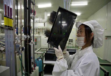 尚德的一名工人在中国无锡的制造厂监控一台机器,蚀刻晶硅片表面,以用于太阳能电池。这种机器采用尚德开发的新工艺,有助于太阳能电池吸收更多的光。