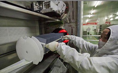 一名工人在检查晶圆,这种晶圆经过某种方式处理,有助于吸收更多的光。