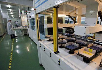 一名工人在分捡太阳能电池,这些电池从一台机器上出来,机器在它们表面增加了电触头。这些触头就是电池表面看到的金属线。
