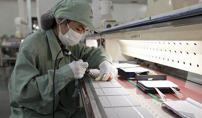 工人们正在把电气连接焊接到太阳能电池上,这样,它们就可以串在一起,制成太阳能电池板。尚德的设备可以自动完成这一步骤,但是,机器弄坏的电池比工人更多,所以通常还是手工完成。