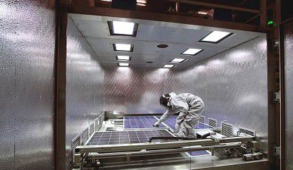这些工人们对齐成串的太阳能电池,他们是在灯箱上对齐,这样他们就可以看到标线。他们把这些电池夹在保护薄片和玻璃盖之间,然后,随后采用大型层压机,把电池密封到位。