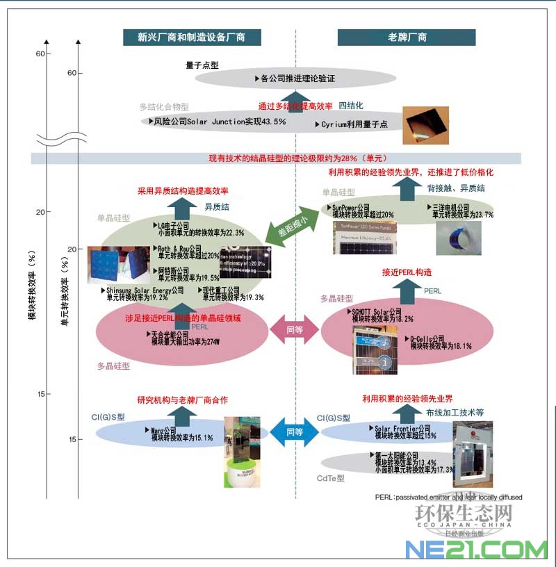 以亚洲为中心的新兴太阳能电池厂商开始推出与日美欧的老牌厂商相匹敌的成果。从事太阳能电池制造设备业务的厂商也不例外。全部通过采用与老牌厂商相同的技术提高了转换效率。
