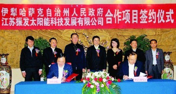 索比光伏网讯:12月11日,江苏振发太阳能科技发展有限公司(以下简称江苏振发)与伊犁州哈萨克自治州人民政府签订了伊犁图开光伏" title="光伏新闻专题">光伏产业园合作协议。江苏振发拟投资100亿元,在图开沙漠划定区域开发600MW光伏电站和设施农业,并建设光伏研究中心和配套设施。自治州领导李学军、毛肯、于青山、李成、王进健及江苏振发太阳能科技发展有限公司董事长查正发、总经理毛海娟等参加签约仪式。
