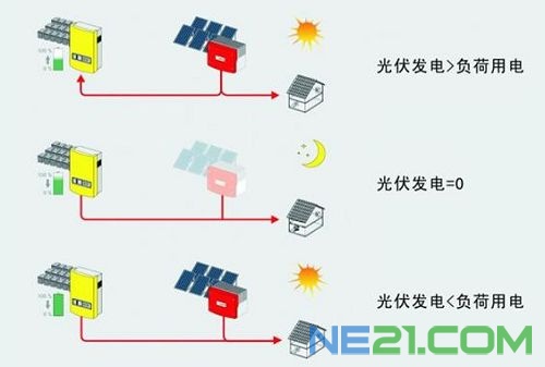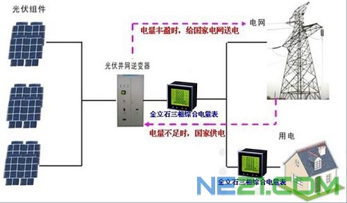 假如某集团每天运行的电器负载是10000W,当太阳能光伏组件接受太阳光产生的直流电经过逆变器转化,变成的交流电是9000W,那么这家集团还需要国家电网配送1000W的电;同样,当太阳能光伏组件产生的电是12000W,多余的2000W则可以送给国家电网,这样不但自己没有用国家的电,反而给国家输送了多余的电,月底或者年底再按照电价补助,这样的集团还是盈利了;当然,如果太阳能光伏提供的电刚好是10000W,那么就平衡了。
