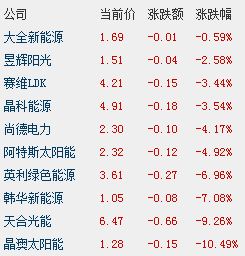 其中,晶澳太阳能大跌10.49%,居成分股跌幅榜榜首;天合光能、韩华新能源、英利绿色能源跌幅均超5%。此外,大全新能源、韩华新能源、晶澳太阳能盘中均创52周股价新低。