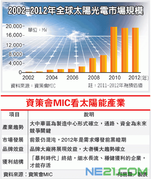 高鸿翔表示,近年全球太阳能市场总需求量都在20GW(10亿瓦)左右,今年可能略微衰退,明年小幅成长,市场需求平平,但全球新产能开出过快,加上欧洲市场低迷,是造成此波太阳能产业市况一蹶不振的主因。