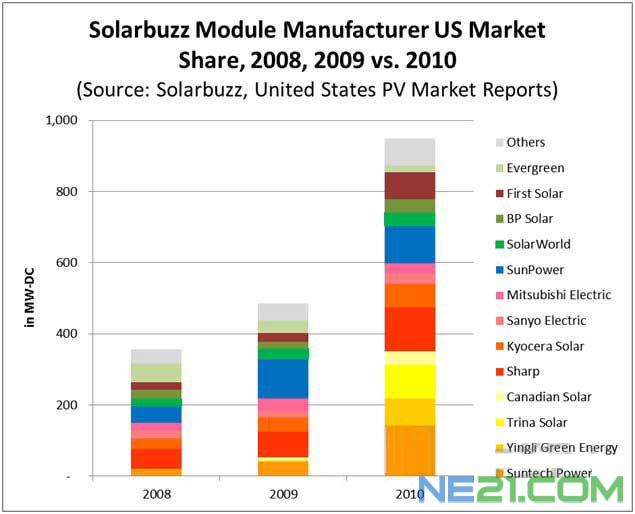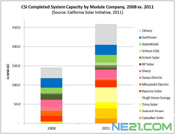 美国最大级别的光伏发电鼓励政策——加利福尼亚太阳能计划(CSI)数据显示,最近中国厂商的系统装机量增加。2008年中国的阿特斯、尚德电力、天合光能及英利绿色能源控股公司的合计市场份额仅占3%,而2011年(截止11月底)则迅速扩大到了36%。Solarbuzz的美国市场数据也显示出了相同的倾向,预计2011年中国企业的份额会进一步增加。