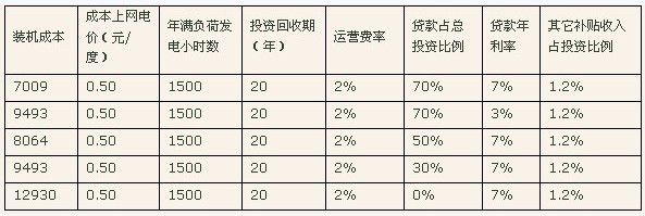 表2-1不同商业条件下,成本电价为0.5元/度时的装机成本