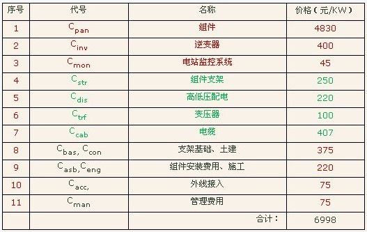 目前的光伏装机成本为11160元/KW,要达到上述比例,必须降低到7009元,假定电站的所有部分按照同样比例下降,则各部分成本见表2-2。