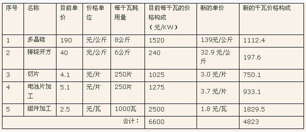 可见,光伏组件单元目前的价格是6600元,要降低到4830元,假如所有单元按照同比降价,则各部分的价格如表2-3所示。