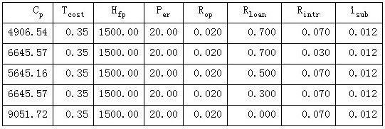 式(1)即为光伏发电的成本电价的计算公式。它表示出了光伏电站的成本电价与光伏电站的单位装机成本Cp、投资回收期Per、运营费用比率(每年的运营费用占电站总投入的比例)Rop、贷款状况(包括贷款占投资额的比例Rloan和贷款利息Rintr两个参数)、年等效满负荷发电小时数Hfp(相当于1KW装机容量一年所发电量的千瓦时数)等五大因素的具体关系。此外,还有该电站所享受到的其它补贴收入系数isub(电站每年的电价外补贴占电站总投资的比例。
