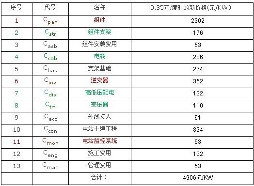 表2-6上网电价为0.35元/度时的光伏组件各部分的价格构成