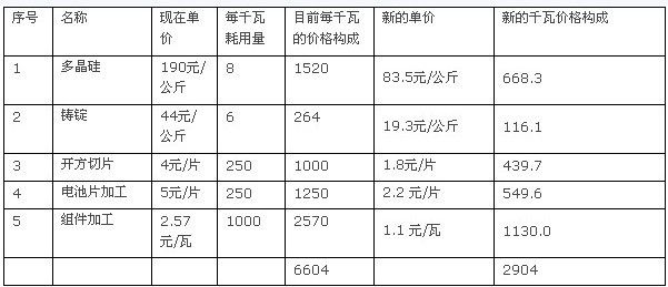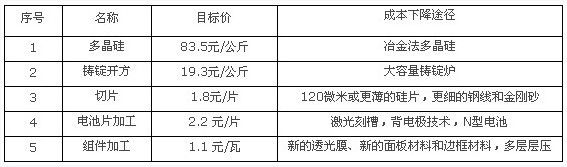 表2-3意味着,假如光伏组件各个部分按照同样比例下降的话,要想达到0.5元/度的光伏上网电价,则多晶硅要降到13.9元/公斤,铸锭加开方成本要降低到25.6元/公斤,切片成本要降低到3元/片,电池片加工成本要降低到3.7元/片,组件加工成本要降低到1.8元/瓦。