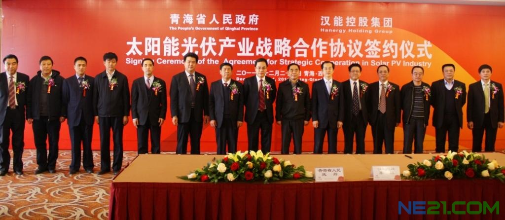 汉能集团董事局主席李河君在签约仪式上宣布,汉能控股集团将在青海海东地区、海西蒙古族藏族自治州、海南藏族自治州等地投资建设太阳能薄膜电池生产基地、太阳能薄膜光状(并网)电站和光伏建筑一体化项目。一期工程投资为100亿元,5年之内预计投资将达到300亿元以上。