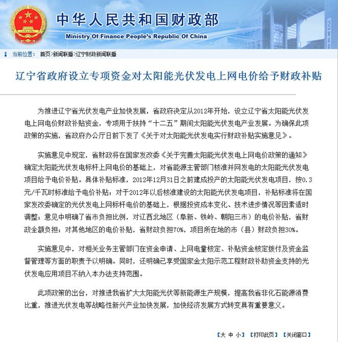 索比光伏网讯:中国财政部发布新闻称,辽宁省政府设立专项资金用于扶持太阳能光伏" title="光伏新闻专题">光伏发电产业。对于2012年12月31日之前建成投产的太阳能光伏发电项目,将按每千瓦时0.3元(0.05美元)标准给予电价补贴。下图是其页面截图,此举有望将光伏发电企业的收入增加逾四分之一。