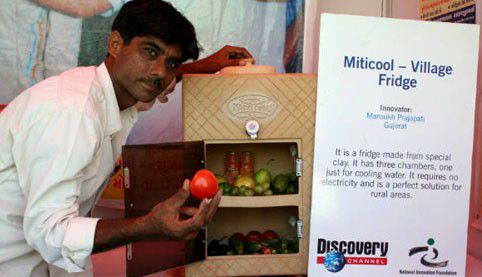 印度工程师曼苏克拜·普拉贾帕迪(MansukhbhaiPrajapati)于2006年开发出一种太阳能冰箱,它是由粘土制造的,全部电力来源于太阳能,可以保持新鲜食物五天,这在没有电的乡村地区价值不菲。
