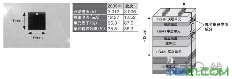| 太阳能电池单元的构造和各种特性 夏普的化合物多接合型太阳能电池,实现了全球最高的36.9%单元转换效率。减少连接各层的隧道结层的串联电阻成分,从而提高了输出功率。(图:由本杂志根据夏普的资料制作而成) |
