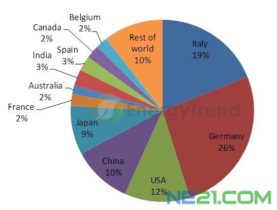 根据EnergyTrend的预估,2011年全球太阳能市场安装量将来到19GW,但产业整体的库存量(包括成品与半成品)将高达10GW左右,因此就产业链的供需状况来看仍是处于严重供过于求。展望2012年,EnergyTrend预估全球市场需求量约维持在19GW左右,需求无法成长的主因在于欧洲市场的需求受到政策调整的影响,意大利、德国、英国等国的需求呈现下滑的态势;另一方面,亚洲市场的需求受到政策的鼓励而出现成长的状况,但像中国、日本、马来西亚、与泰国等,2012年的需求仍处于小幅成长的状况,EnergyTrend预估至2013年市场才会出现强劲的成长。除此之外,北美与印度市场虽然受到瞩目,但这二大市场仍有问题需求解决。在北美市场来看,美国市场受到Cash Grant法案将于2011年底到期的影响,2012年将以Tax Credit法案接手,然EnergyTrend认为Tax Credit对于推升市场发展的力道有限,使得2012年美国市场处于混沌不明的状况。而在印度市场方面,虽然National Solar Mission的推行让印度市场具有庞大的潜在需求,但中央与地方政府的执行效率与财务状况,再加上在地自制率(Local Content Requirement)的推行,将是影响印度市场未来发展的不确定因素。