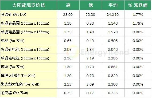而在本周现货报价部分,多晶硅与硅片同步呈现走扬的趋势,但涨幅在1%上下。多晶硅目前成交价最低仍维持在20美元/公斤;而平均价位则上扬到24.21美元/公斤,涨幅为1.77%;而在硅片部分,多晶的最低价格来到0.8美元/片,厂商表示是欧洲厂商的产品,除特殊状况外采用的机率很低;而单晶的最低价格则维持在1.48美元/片;本周多晶硅片的平均价格来到1.14美元/片,涨幅为1.79%,主要是受到高效产品价格上涨的影响;而单晶硅片则维持不动,平均价格为1.57美元/片。而在电池方面,本周平均价格维持在0.505美元/瓦,与上周相同。然而更精确来看,目前高效产品的价格可以来到0.55美元/瓦—0.65美元/瓦,但一般品的价位则在0.49美元/瓦—0.53美元/瓦,价格差距来到13%—22%。