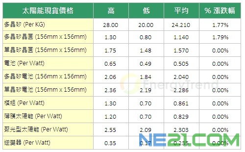 而在本周现货报价部分,多晶矽与矽外延片同步呈现走扬的趋势,但涨幅在1%上下。多晶矽目前成交价最低仍维持在$20/kg;而平均价位则上扬到$24.21/kg,涨幅为1.77%;而在矽外延片部分,多晶的最低价格来到$0.8/piece,厂商表示是欧洲厂商的产品,除特殊状况外采用的机率很低;而单晶的最低价格则维持在$1.48/piece;本周多晶矽外延片的平均价格来到$1.14/piece,涨幅为1.79%,主要是受到高效产品价格上涨的影响;而单晶矽外延片则维持不动,平均价格为$1.570/piece。而在电池方面,本周平均价格维持在$0.505/watt,与上周相同。然而更精确来看,目前高效产品的价格可以来到$0.55/watt~$0.65/watt,但一般品的价位则在$0.49/watt~$0.53/watt,价格差距来到13%~22%。