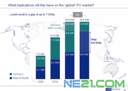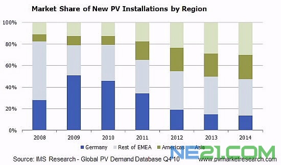 IMS Research预测德国的全球市占率在2010年下降到46%,而在2011年掉到35%以下。另外,未来四年全球的新PV产能可增加至100GW以上。
