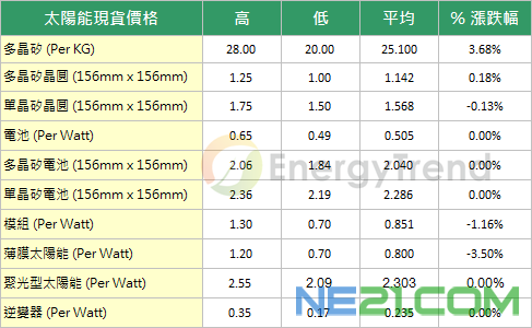 由于欧美客户急单涌入,台湾电池厂的产能利用率明显提升,连带也影响到合约与现货价格的未来发展。根据集邦科技(TrendForce)旗下研究部门EnergyTrend本周的调查,目前上游多晶矽的合约价仍未谈定,买卖双方仍对最终价格持续沟通中,然目前电池厂受惠急单效应,产能明显回升,因此多晶矽厂打算利用此一时机调涨合约价格,而此一发展连带影响到现货市场的走势,使得本周多晶矽现货价格仍然维持上涨的局面。