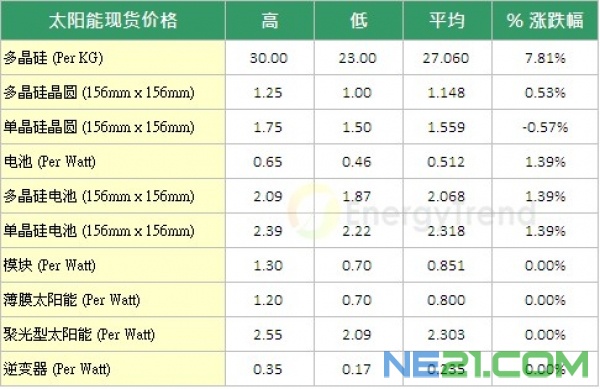 而在本周现货报价部分,多晶硅目前最低成交价小涨到$23/kg;而平均价位受到市场加温的影响,上扬到$27.06/kg,涨幅为7.81%,为近几个月来的最大涨幅;而在硅晶圆部分,最低成交价仍维持平盘,多晶价格为$1.0/piece而单晶价格则是$1.50/piece;本周多晶硅晶圆的平均价格来到$1.148/piece,涨幅为0.53%,我们认为大陆市场目前仍是以一般品为主,在高效产品的进度上仍然落后台湾厂商,进而拉低多晶硅晶圆产品的平均成交价;而单晶硅晶圆则小幅下跌,平均价格为$1.559/piece,跌幅为0.57%。而在电池方面,本周平均价格出现小涨的局面,本周的平均成交价格为$0.512/Watt,涨幅为1.39%,而在模块方面,本周模块处于持平的局面。相关厂商表示,由于目前仍处亏损的局面,如果上游价格持续上涨,未来将视情况调整出货价格。
