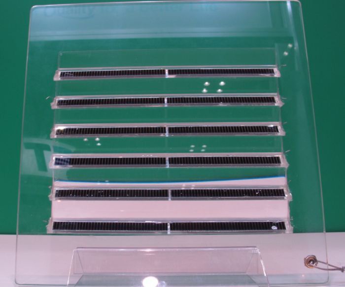 该太阳能光伏电池组件的制作原理是在棱镜的一面粘贴太阳能光伏电池单元,然后将其粘贴在透明的基板上。而此次采用的太阳能光伏电池则是对其他公司的结晶硅型太阳能光伏电池进行细致切割而成的。
