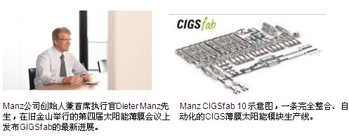 据市场分析人员预计,CIGS模块市场在未来三年将会翻倍。在所有薄膜技术中,CIGS(铜铟镓硒太阳能薄膜电池)在降低成本和提升效率方面最具潜力。Manz的战略合作伙伴ZSW,位于德国斯图加特的太阳能和氢能研究机构Baden-Württemberg在实验室条件下的最高转化率已经超过20%,这是一项世界纪录,几乎达到了多晶硅电池的最高效率。在今年年初并购的Würth Solar整条创新生产线上,Manz制造出了拥有14%实际量产模块效率(受光面积效率15.1%)的太阳能电池板,开创了该领域的世界记录。