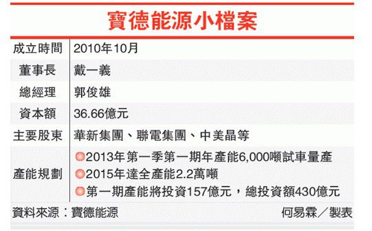 宝德董事长戴一义指出,第一期年产能6,000吨,2013年建构二期产线,2015年达全产能2.2万吨。宝德第一期产能将投资157亿元,三期总投资额达430亿元。配合后续扩产资金需求,将以每股16元办理12亿元现金增资,预计2月完成。