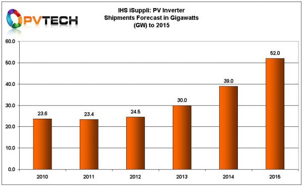 索比光伏网讯:据iSuppli公布的一份《光伏" title="光伏新闻专题">光伏逆变器市场追踪报告》称,光伏逆变器的出货量在2011年出现了小幅下跌,但预计有望在2015年前增长一倍至52GW。据这家市场调研公司称,光伏逆变器的出货量在2011年内由上一年度的23.6GW跌至了23.4GW。