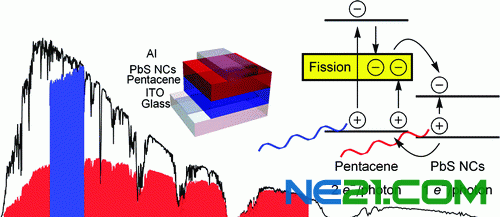 文章中说:“我们演示了一种有机/无机混合的光伏设备架构,采用单线态激子裂变(singlet exciton fission),每吸收一个高能光子,可以收集到两个电子,同时,也可以利用低能量的光子。这种太阳能电池,红外光子吸收使用硫化铅(PbS: lead sulfide)纳米晶体。可见光光子的吸收采用五环素,以创造单线态激子,经过快速激子裂变,产生配对三重线态(triplets)。最重要的是,我们确定,这些三重线态激子可以电离,这要采用有机/无机异质结面(heterointerface)。我们报道的内部量子效率超过50%,而功率转换效率接近1%。这些结果表明,有一种替代方法,可以规避肖克利-奎伊瑟极限(Shockley-Queisser limit),就是单结太阳能电池(single-junction solar cells)功率转换效率的极限。”