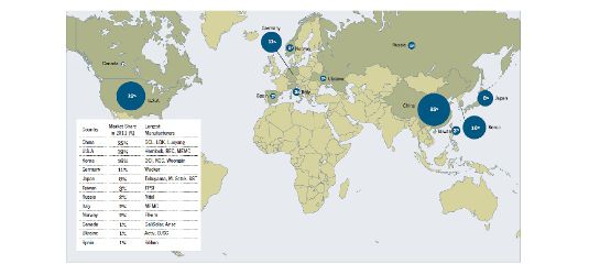 全球多晶硅货源也逐渐向中国、德国、美国、韩国和德国等主要产地倾斜。韩国是一个新兴的市场。上图展示了截止2011年全球主要多晶硅生产地。