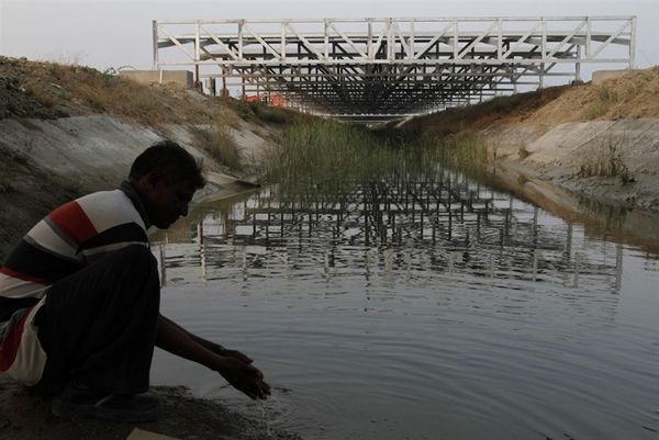 一名印度工人在安装完光伏组件后洗手