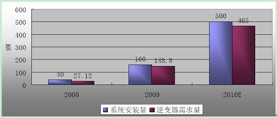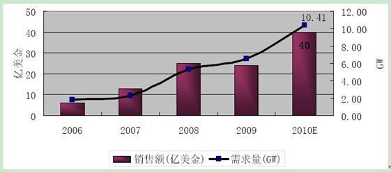 随着近几年光伏系统安装规模的逐渐增大,光伏逆变器的市场随之急剧放大,后期也将与光伏装机容量同步,保持高速增长。预计2010年市场规模达40亿美金,需求量达10.41GW。